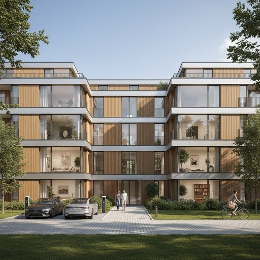 Construction of a multifunctional building within walking distance of the main train station, combining office spaces, apartments, and commercial spaces.
